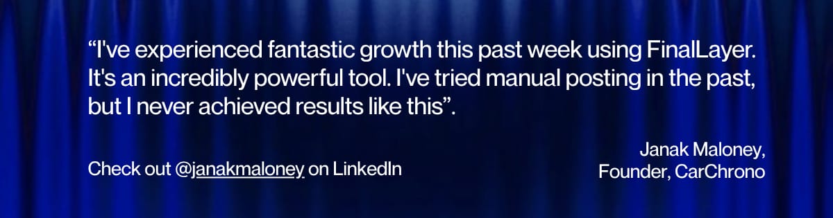 If you are receiving this, you either follow me on one of my socials or you are in the FinalLayer community. If you are a FinalLayer founder, reach out to be featured in this newsletter! And, of course, send me notes any time :).