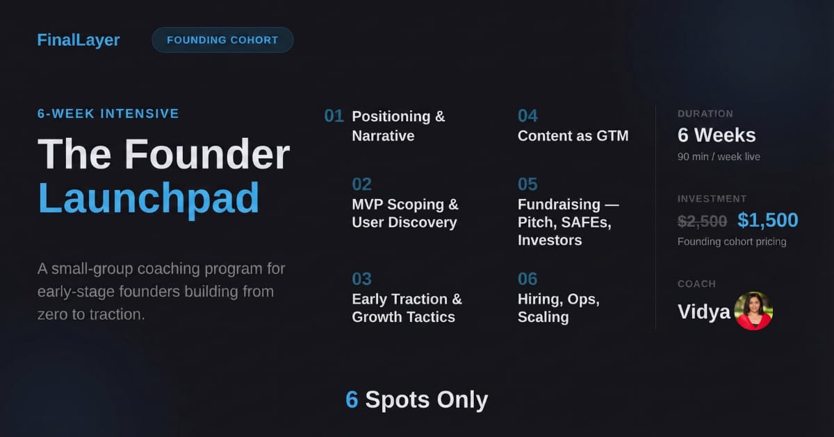 Due to popular demand, I'm launching The Founder Launchpad, a 6-week program for small cohorts of founders. We start April 24th, Fridays 9–10:30 AM PT. The first cohort filled up fast, so I'm opening a second one now. Spots are limited, click below to register.